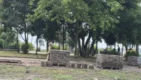 Со стороны набережной демонтируют старую плитку, её складывают на паллеты.