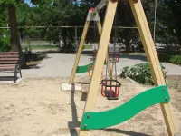 На сравнительно небольшой территории подрядной организацией уже установлены шесть детских игровых элементов из дерева - балансир, горка, качели, вертушка и другие.