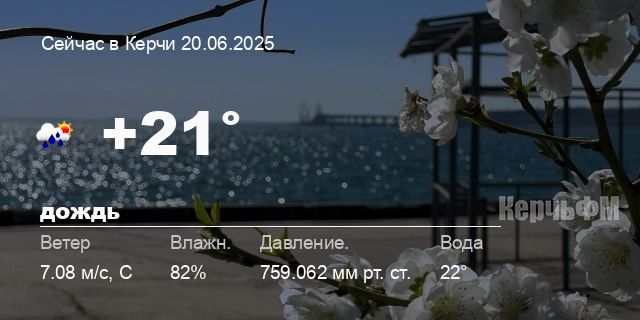 Сегодня днем в Керчи, 20 июня, ожидается небольшой дождь, температура воздуха от +20.4° до +22°С, ветер северный 7.74 м/с, порывы до 6.07 м/с, давление 759.1 мм рт. ст., влажность 64%.