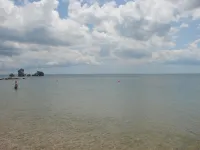 Берег и морская вода очищены от водорослей. Отдыхающие смело располагаются на берегу, не боясь испачкаться или уколоться о сорняки.