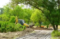На объекте работает 5 единиц техники, выполняется устройство щебеночного основания для последующего мощения плитки на пешеходных зонах. Рабочие выполняют планирование грунта.