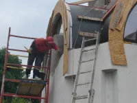 Строители бригады из Краснодара во время непогоды переходят к внутренней отделке часовни.