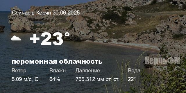 Сегодня днем в Керчи, 30 июня, ожидается небольшой дождь, температура воздуха от +18.8° до +24.3°С, ветер северный 4.58 м/с, порывы до 5.09 м/с, давление 756.1 мм рт. ст., влажность 62%.