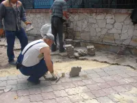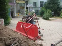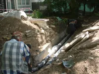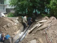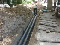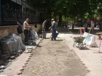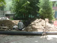 Возле супермаркета "ПУД" новые трубы уже уложили и засыпали. Теперь восстанавливают тротуарную плитку.