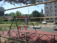 На детской установили игровые элементы в виде подвесных качелей, качели-вертушки, песочницы и других, сделав предварительно антитравматическое покрытие.