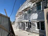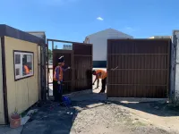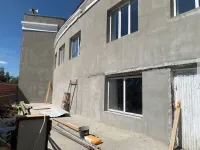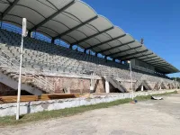 На западной и восточной трибунах установили новую кровлю из профнастила.