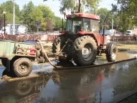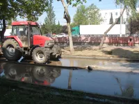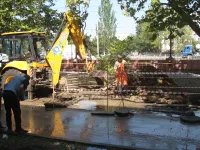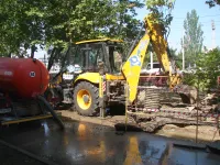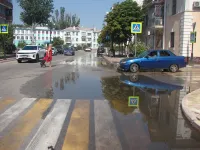На подъезде к центральному рынку со стороны Самойленко аварийная служба водоканала ликвидирует порыв на магистральном водоводе.