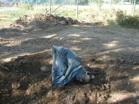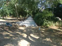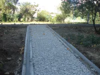 После укладки в грунт электрического кабеля для новых опор уличного освещения, у садика установили вдоль тротуара бордюры и засыпали его щебнем.