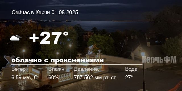 Сегодня днем в Керчи, 01 августа, ожидается небольшая облачность, температура воздуха от +23.2° до +28.3°С, ветер 6.62 м/с, порывы до 6.99 м/с, давление 757.6 мм рт. ст., влажность 49%.