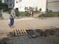 С одной стороны подход к тротуару вчера засыпали гравием. С другой стороны настил положили кое-как, разбросав по бокам плитку и камни.