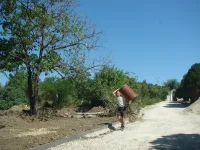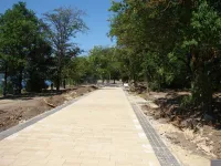 Метр за метром преодолевают устроители, укладывая новую тротуарную плитку на центральной аллее и новой аллее по возвышенности у моря.