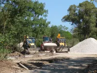 На будущих пешеходных дорожках ведется укладка бордюров и их засыпка гравием.