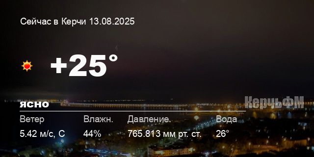 Сегодня днем в Керчи, 13 августа, ожидается ясная погода, температура воздуха от +22.5° до +26.1°С, ветер северный 5.31 м/с, порывы до 5.42 м/с, давление 765.8 мм рт. ст., влажность 40%.