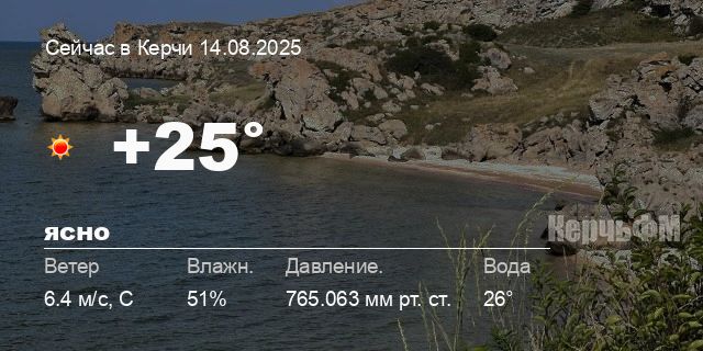 Сегодня днем в Керчи, 14 августа, ожидается ясная погода, температура воздуха от +21.1° до +27.1°С, ветер северный 5.24 м/с, порывы до 6.4 м/с, давление 764.3 мм рт. ст., влажность 43%.