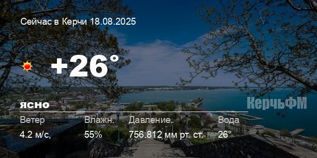 Сегодня днем в Керчи, 18 августа, ожидается ясная погода, температура воздуха от +21.8° до +29.1°С, ветер северный 1.15 м/с, порывы до 4.63 м/с, давление 756.8 мм рт. ст., влажность 50%.