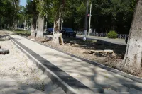 Продолжается мощение пешеходных зон. Всего предстоит уложить около 10 тысяч квадратных метров плитки. Устанавливают закладные под фонари, которых будет больше 200.