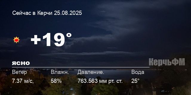 Сегодня днем в Керчи, 25 августа, ожидается ясная погода, температура воздуха от +17.8° до +22°С, ветер 6.11 м/с, порывы до 10.93 м/с, давление 763.6 мм рт. ст., влажность 56%.