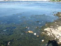 Причина в водорослях у берега и больших островков тины на поверхности водной глади в десятке метров от него.
