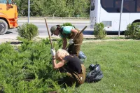 Сегодня работы по прополке, удалению сорной растительности и рыхлению почвы велись на кольце по улице Чкалова, вчера аналогичные работы были проведены на кольце автовокзала.
