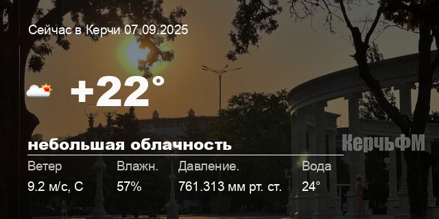 Сегодня днем в Керчи, 07 сентября, ожидается ясная погода, температура воздуха от +20.7° до +24°С, ветер северный 8.99 м/с, порывы до 9.55 м/с, давление 760.6 мм рт. ст., влажность 55%.