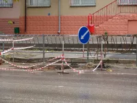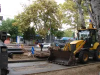 Работы проводятся заранее, чтобы не снимать новое асфальтовое покрытие позже: вскрыт асфальт, подняты плиты, задействована техника.
