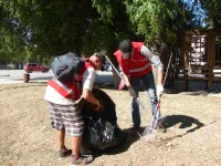 Бригады в красных жилетах работают на межквартальных пространствах, поддерживая порядок в общественных местах.