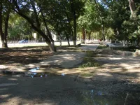 Болото не просыхает. Вода стекает по улице на тротуар, ведущий к школе №17.