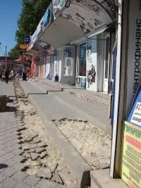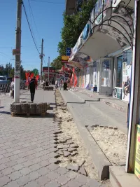 У торговых павильонов напротив центрального рынка по улице Еременко начали демонтировать старую тротуарную плитку.