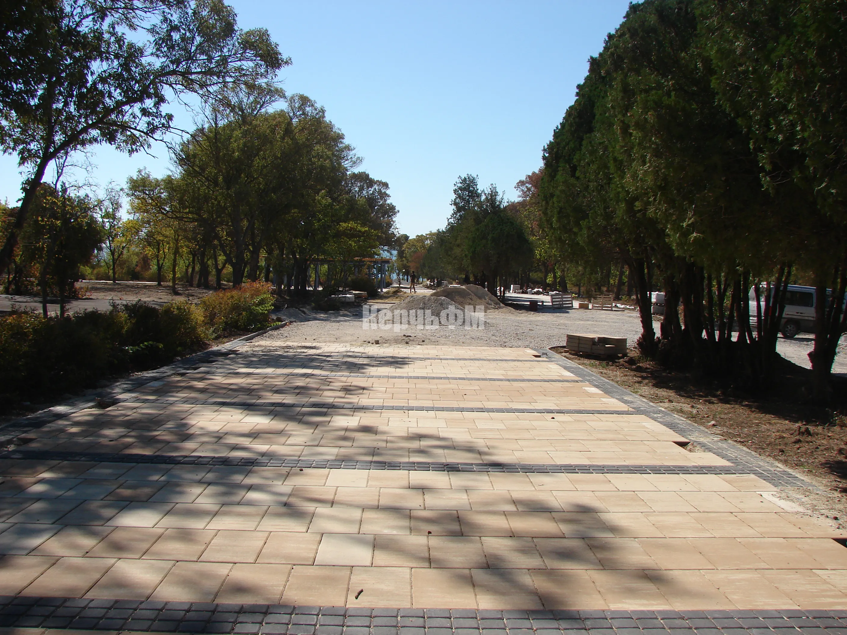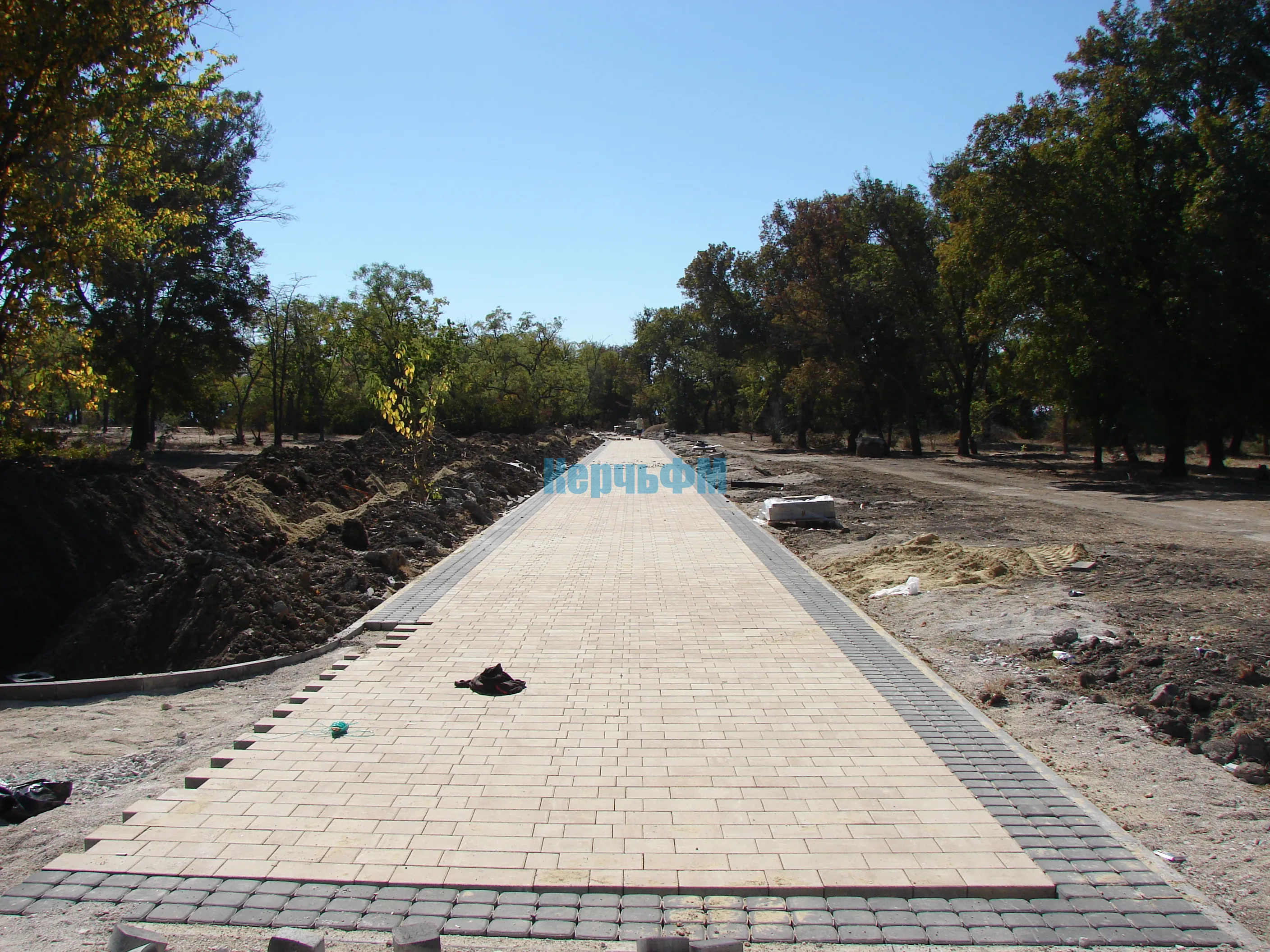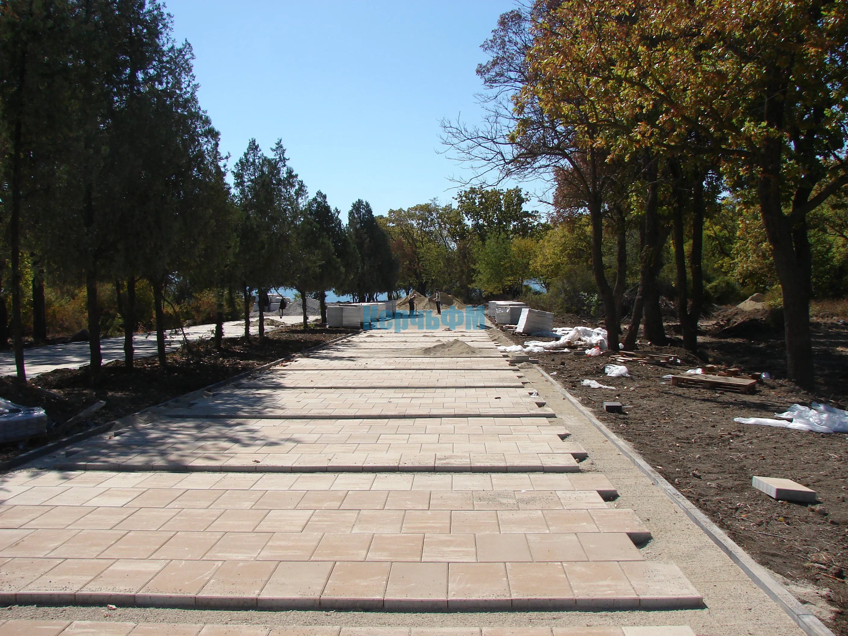 На центральной аллее Приморского парка ведется укладка тротуарной плитки.