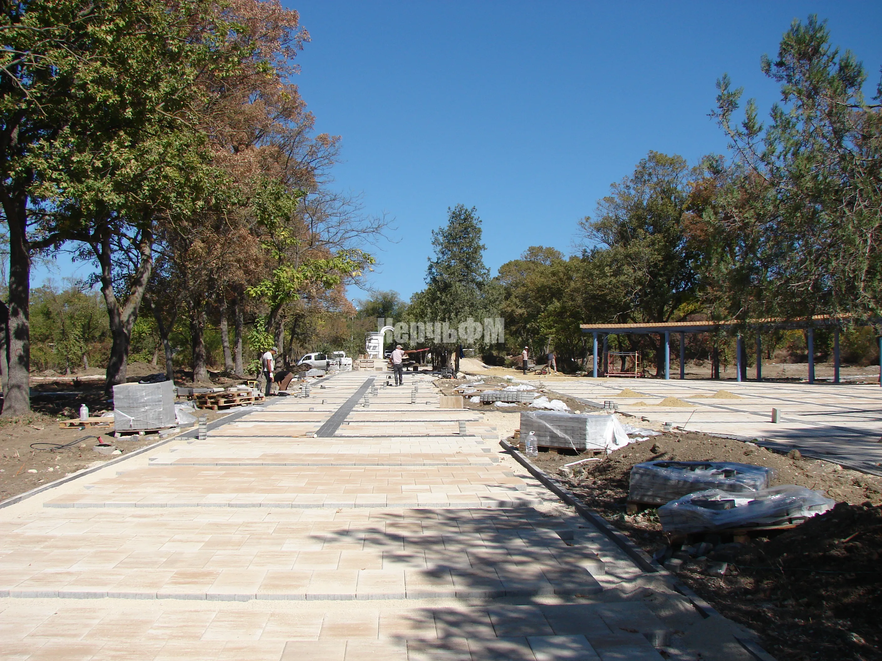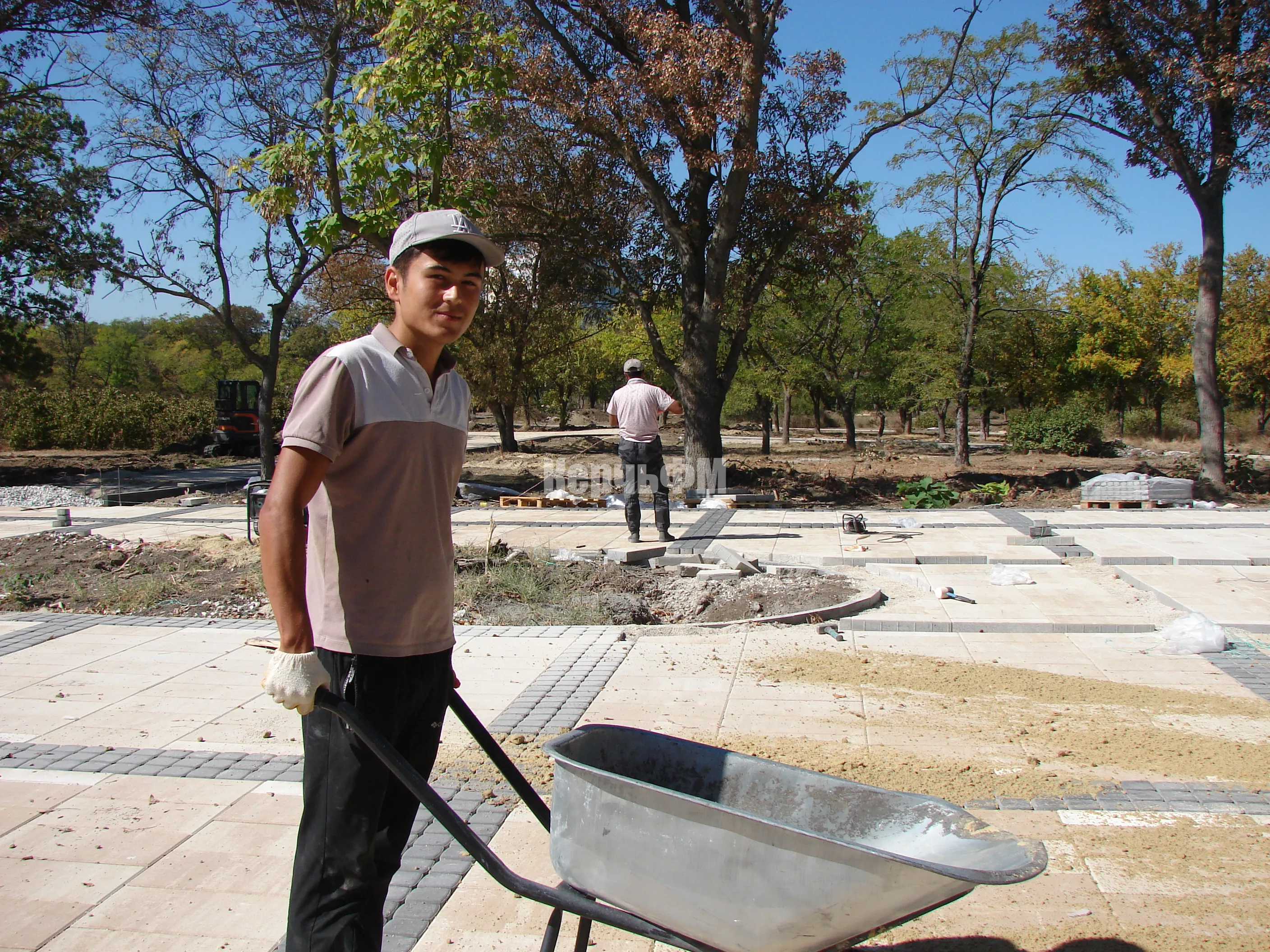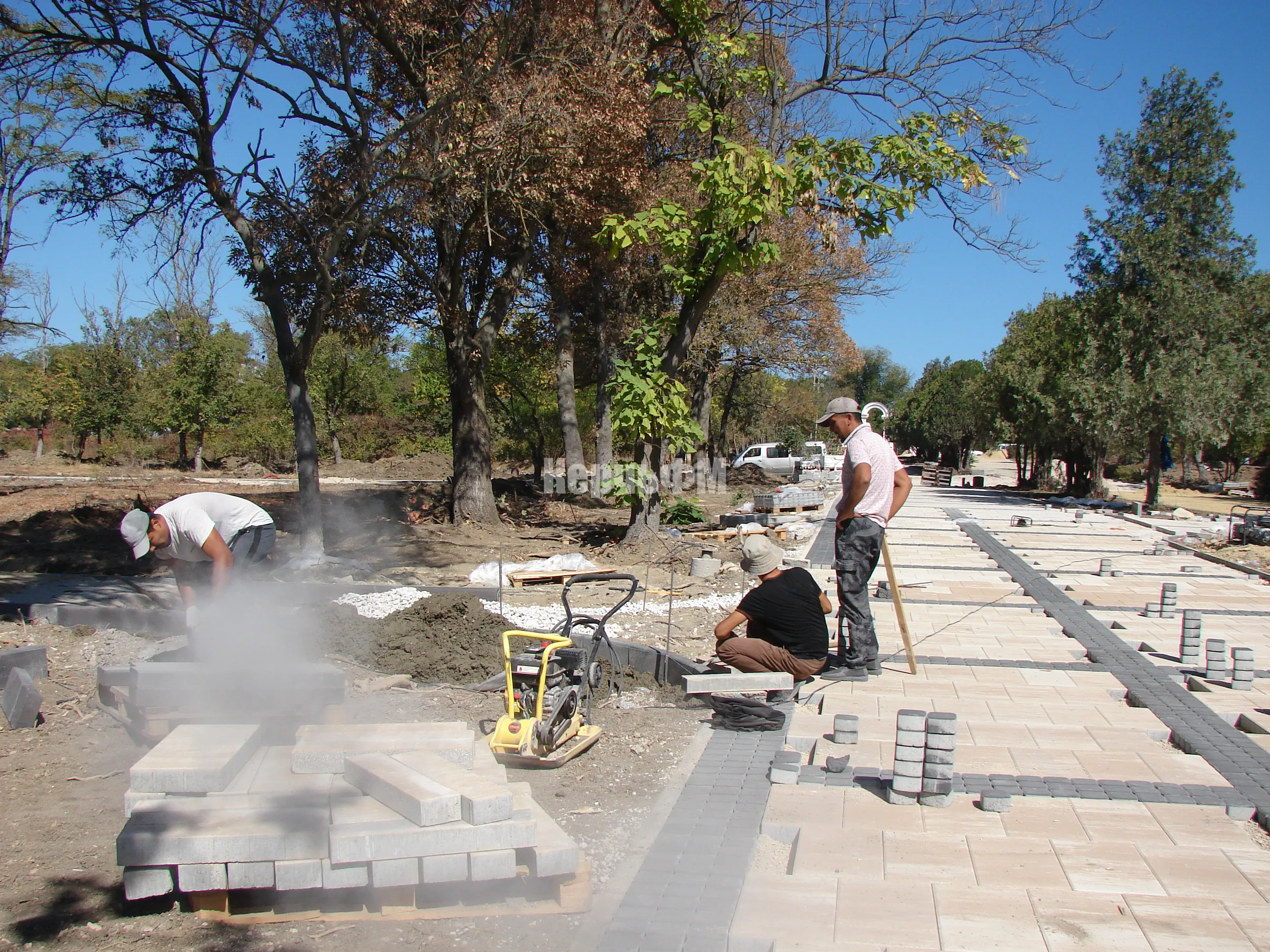 На центральной аллее Приморского парка ведется укладка тротуарной плитки.