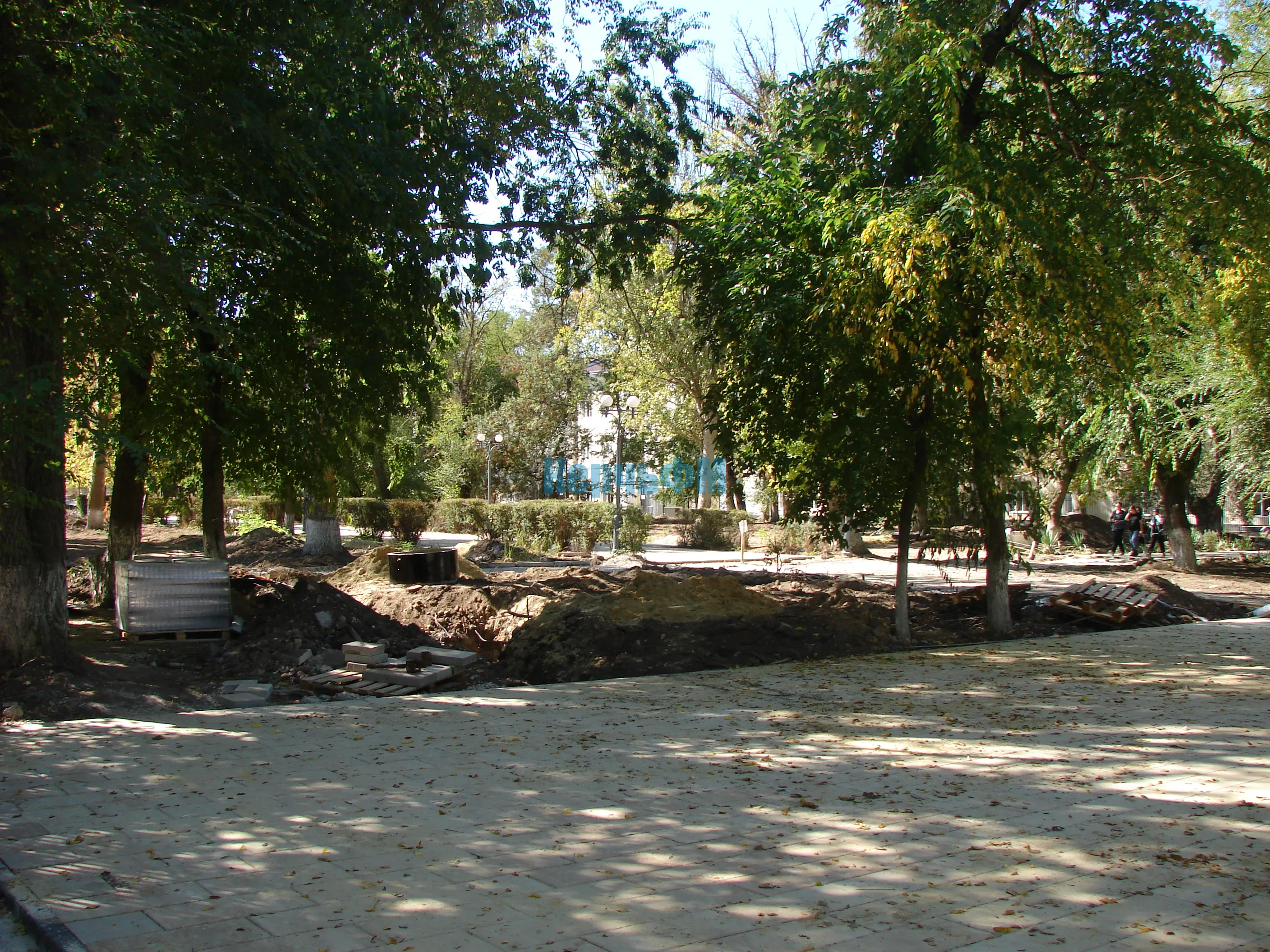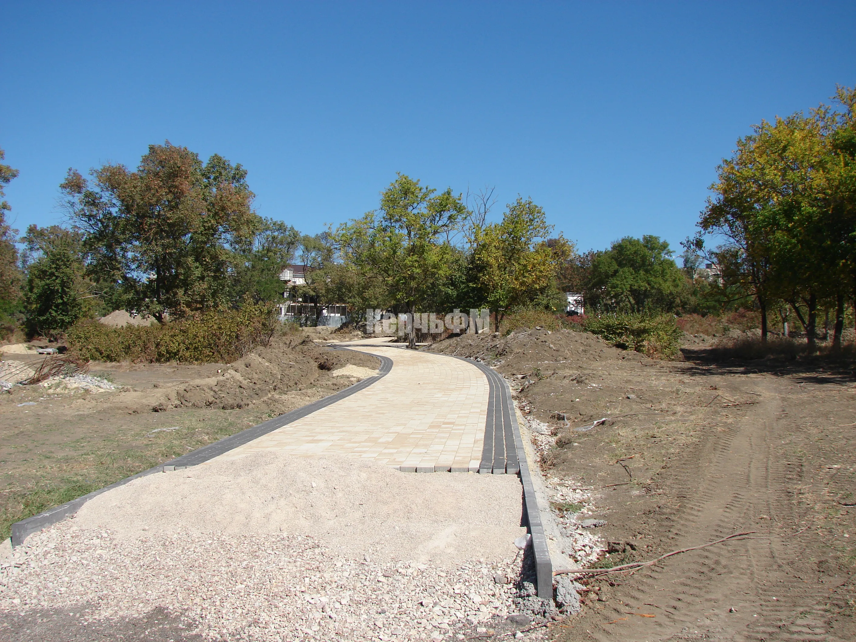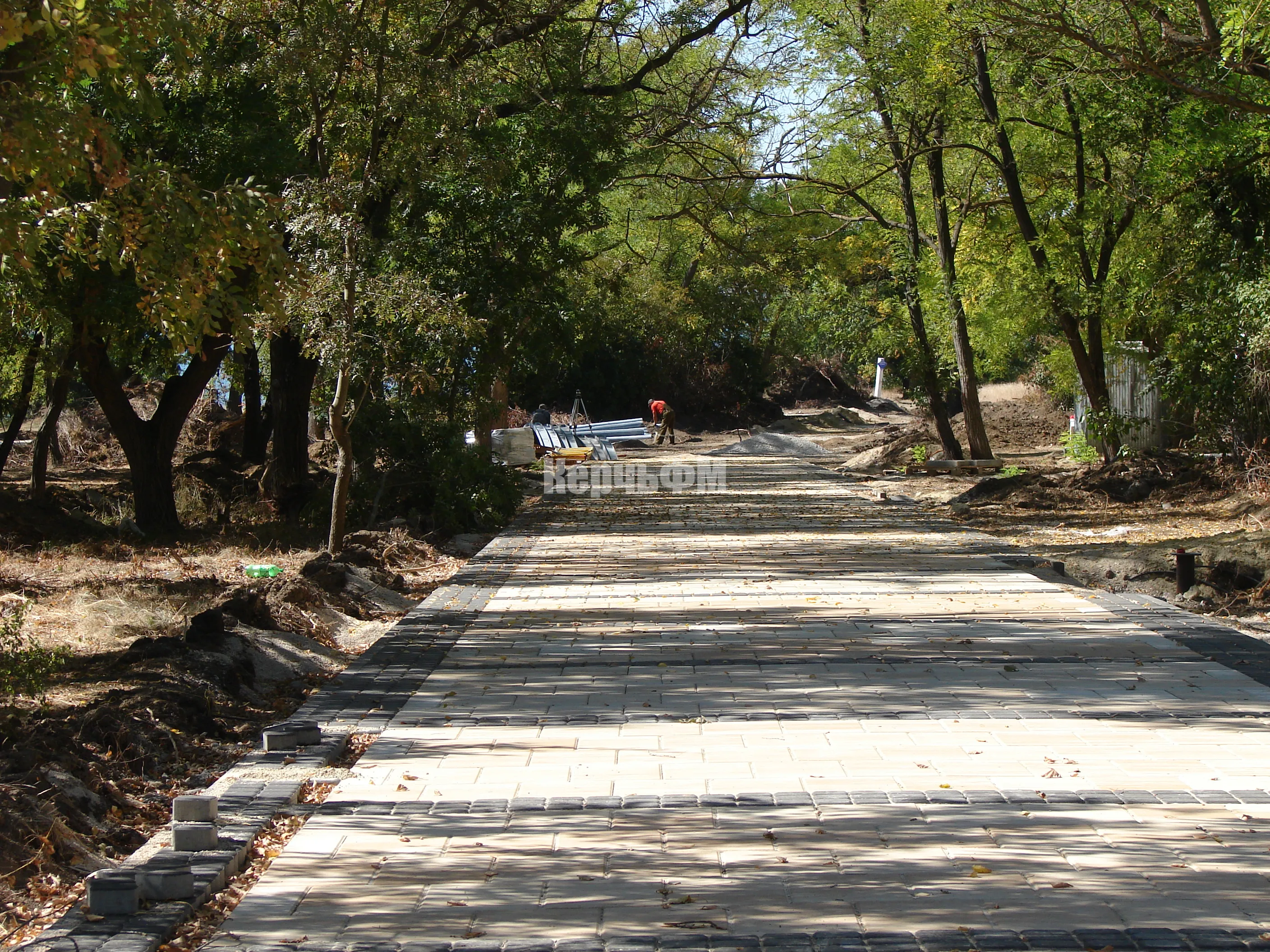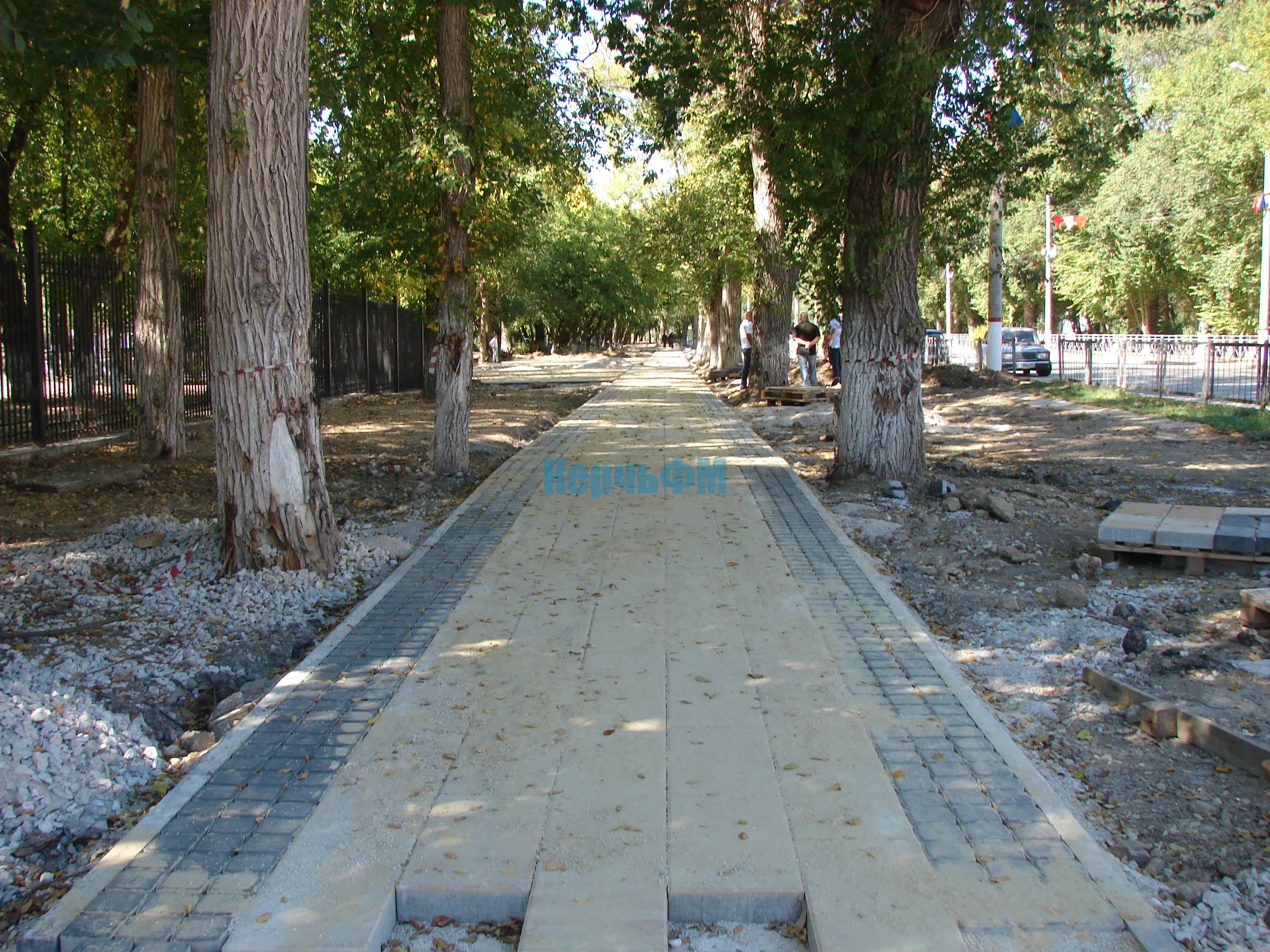 На пешеходной дорожке вдоль политехнического техникума также укладывается новая тротуарная плитка.