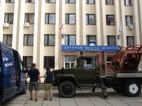 Парковку у здания со стороны дороги оцепили заранее, чтобы на время съемок мог припарковаться транспорт съемочной группы, передает КерчьФМ.