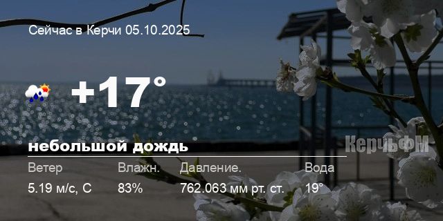 Сегодня днем в Керчи, 05 октября, ожидается небольшой дождь, температура воздуха от +16.1° до +18.3°С, ветер северный 5.57 м/с, порывы до 6.22 м/с, давление 761.3 мм рт. ст., влажность 69%.