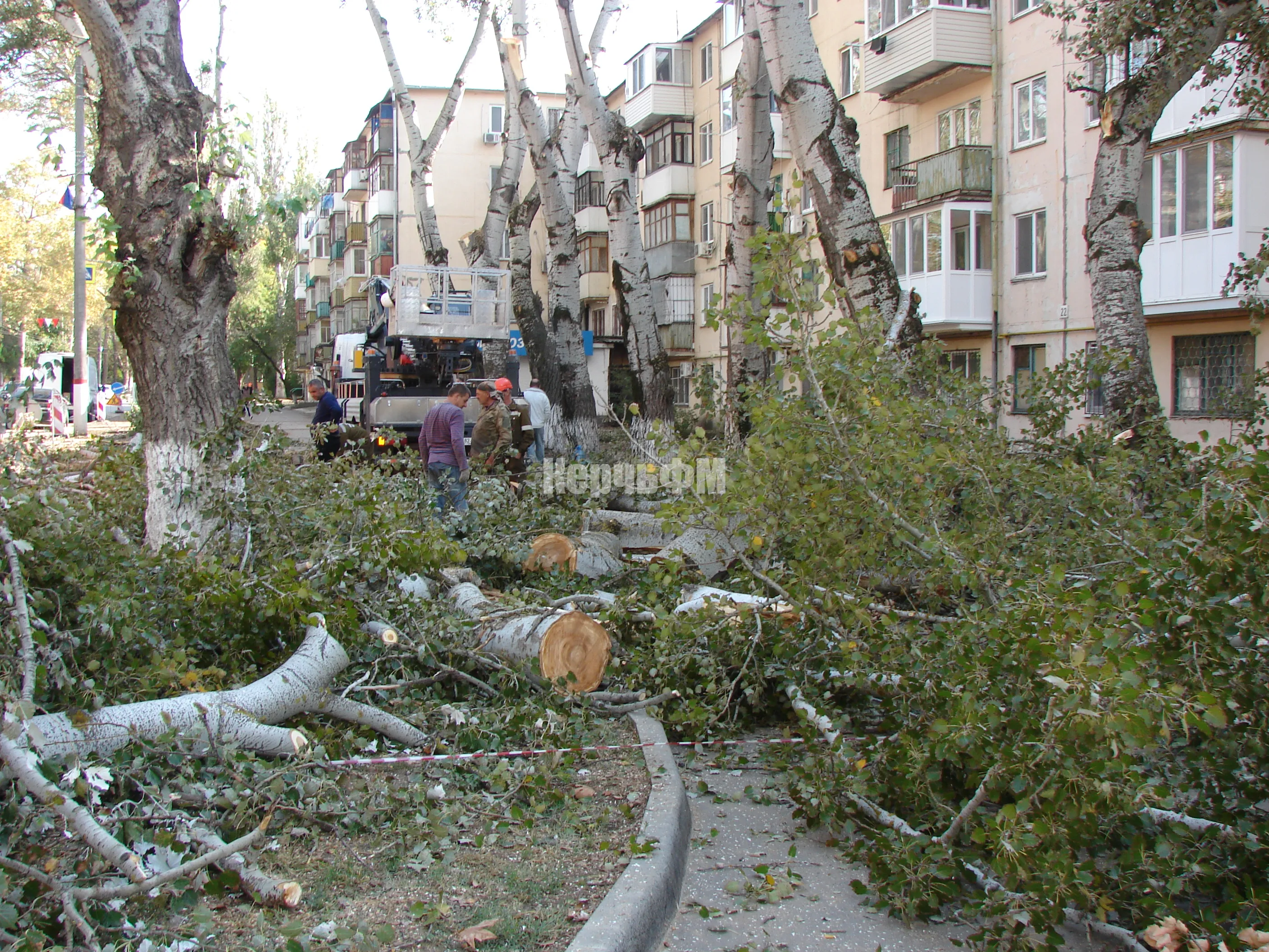 У дома по Горького, 22 в Керчи ведется спил высоких деревьев