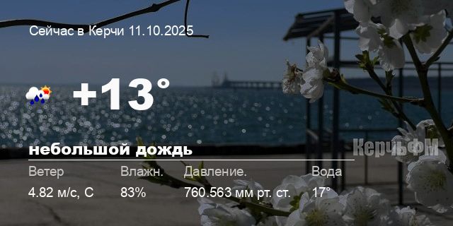 Сегодня днем в Керчи, 11 октября, ожидается переменная облачность, температура воздуха от +13° до +14.5°С, ветер северный 5.24 м/с, порывы до 9.87 м/с, давление 759.8 мм рт. ст., влажность 70%.