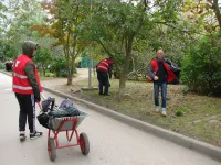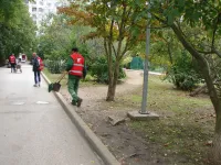 Рабочие убирают опавшие листья и мусор, а также устраняют последствия выпадения осадков.