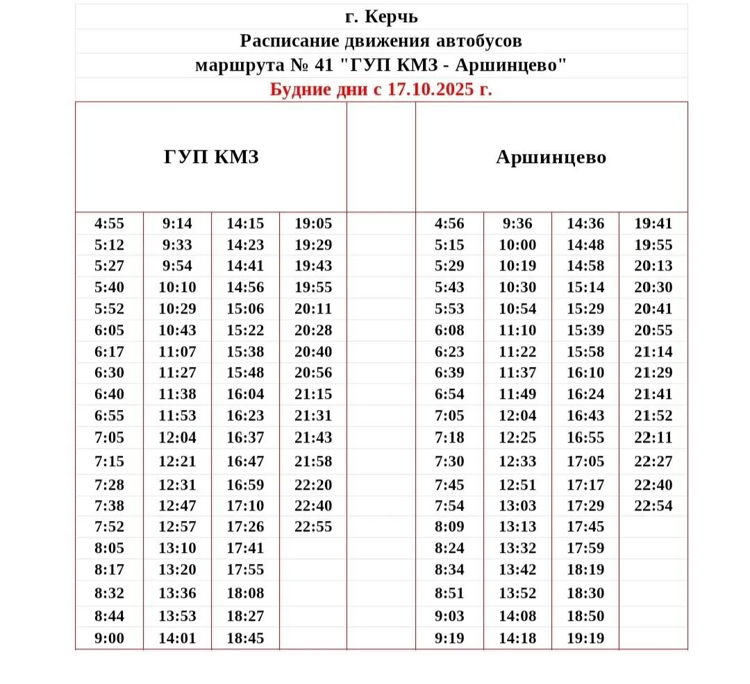 С 17.10.2025 г. будет изменено расписание движения автобусов на муниципальном маршруте регулярных перевозок №41 «ГУП КМЗ - Аршинцево - Горпляж (в будние дни).