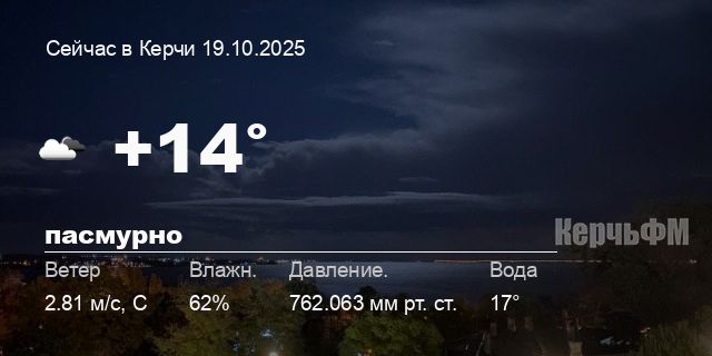 Сегодня днем в Керчи, 19 октября, ожидается пасмурная погода, температура воздуха от +11.8° до +13.7°С, ветер северный 3.36 м/с, порывы до 7.54 м/с, давление 761.3 мм рт. ст., влажность 69%.