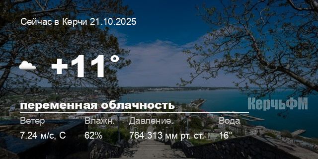 Сегодня днем в Керчи, 21 октября, ожидается переменная облачность, температура воздуха от +9.3° до +12.5°С, ветер северный 6.23 м/с, порывы до 7.79 м/с, давление 764.3 мм рт. ст., влажность 52%.