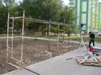 Рядом на территории мастера готовят флагштоки, которые установят справа от входа.