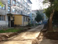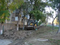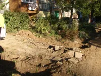 А с фасадной стороны дома начался демонтаж тротуарной плитки.