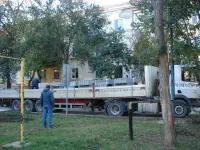 Здесь уже демонтированы все старые бордюры, тяжелая техника завозит и разгружает новые, передает КерчьФМ.