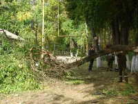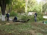 Специалисты Службы городского хозяйства Керчи ведут спил веток и стволов высоких деревьев в разных районах города.