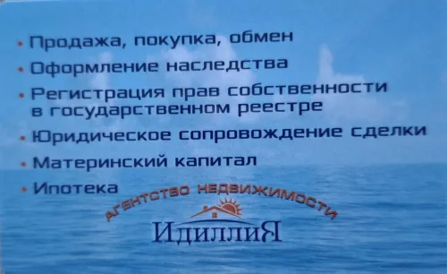 Агентство недвижимости Идиллия зарекомендовало себя как надежное агентство на российском рынке недвижимости, предоставляя высококачественные риелторские услуги в г. Керчь и Крыму. Наша команда профессионалов готова помочь вам в продаже, покупке или обмене любых объектов недвижимости, обеспечивая индивидуальный подход к каждому клиенту.