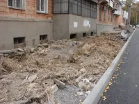 Вдоль тротуара с одной стороны уложены новые бордюры.