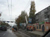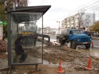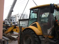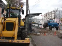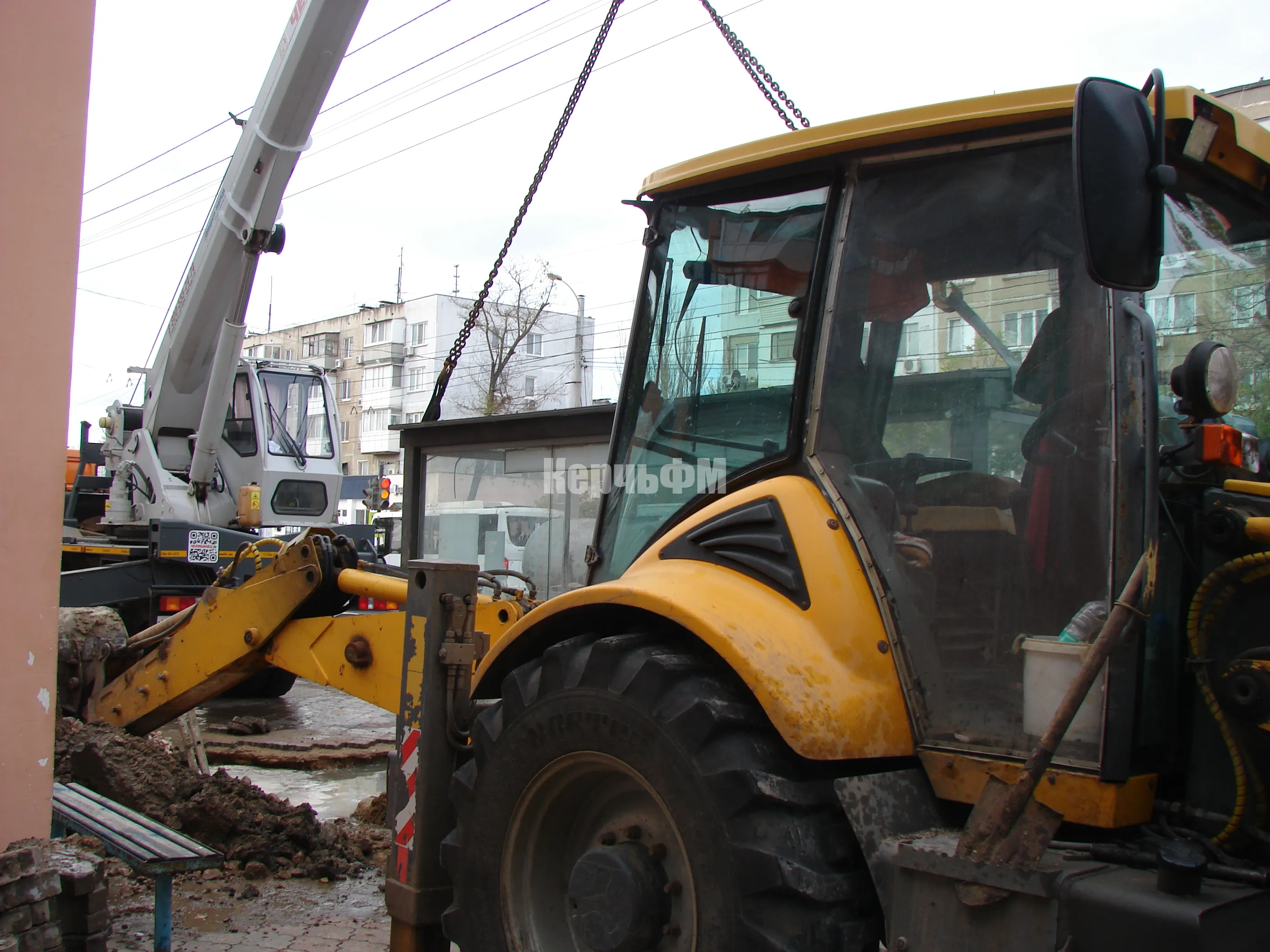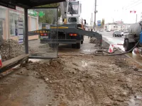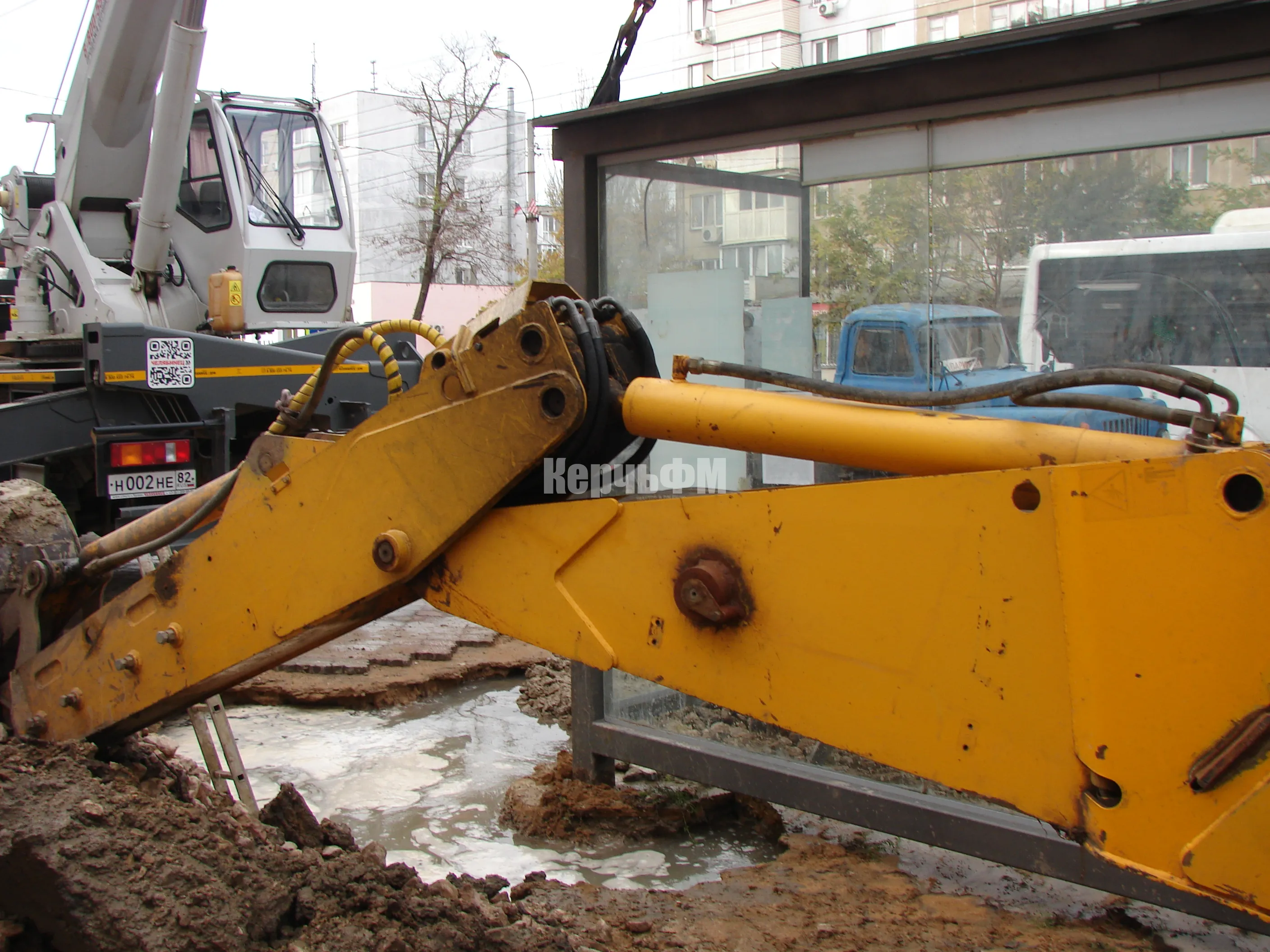 Подъемным краном сдвинули остановочный павильон, чтобы подобраться к аварийному участку трубы.
