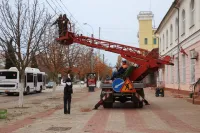 На улице Кирова, в районе гостиницы «Керчь», сотрудники Зеленхоза формируют кроны каштанов, придавая им аккуратную сферическую форму. Это необходимо для поддержания эстетики городских улиц и здоровья деревьев.