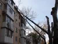 Оставшийся ствол одного из деревьев во время сильного ветра наклонился к дому так, что грозил обрушиться на кровлю пятиэтажного МКД.