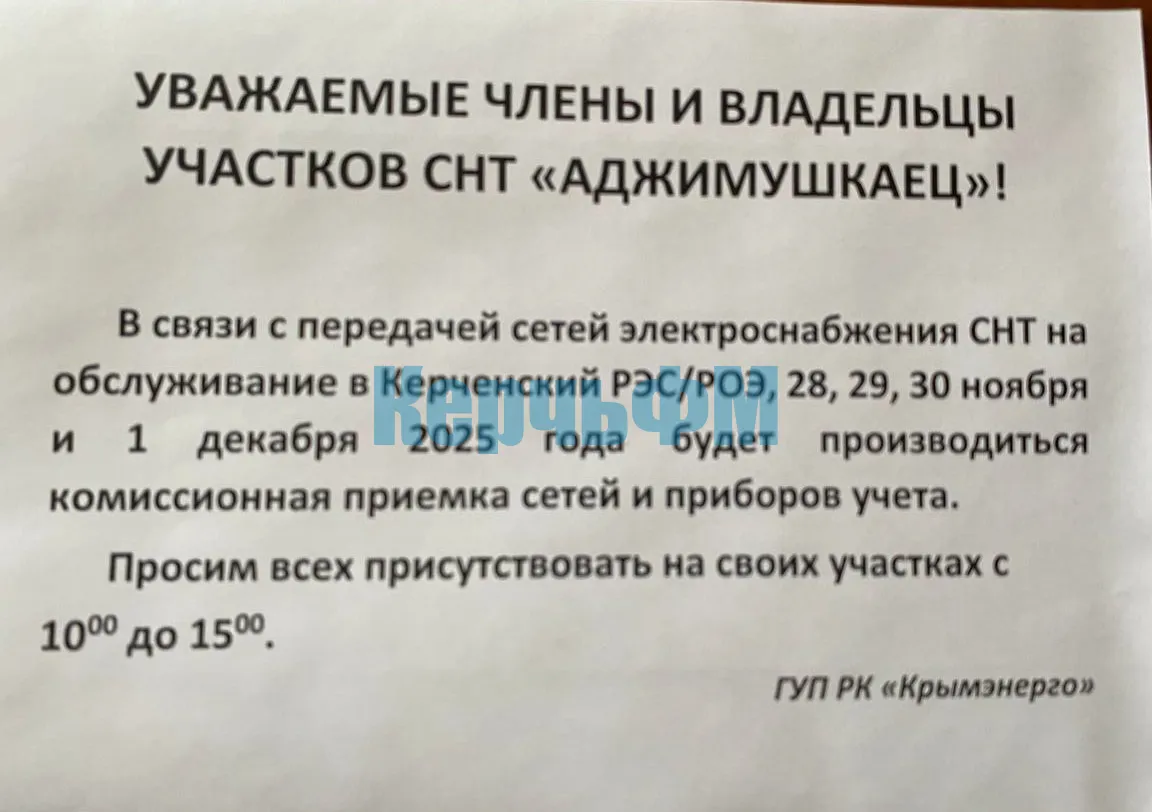 28, 29, 30 ноября и 1 декабря совместная комиссия представителей Керченского и Ленинского РЭС и РОЭ обойдет участки, посмотрит приборы учета и зафиксирует показания.