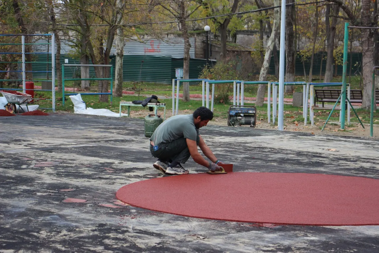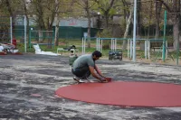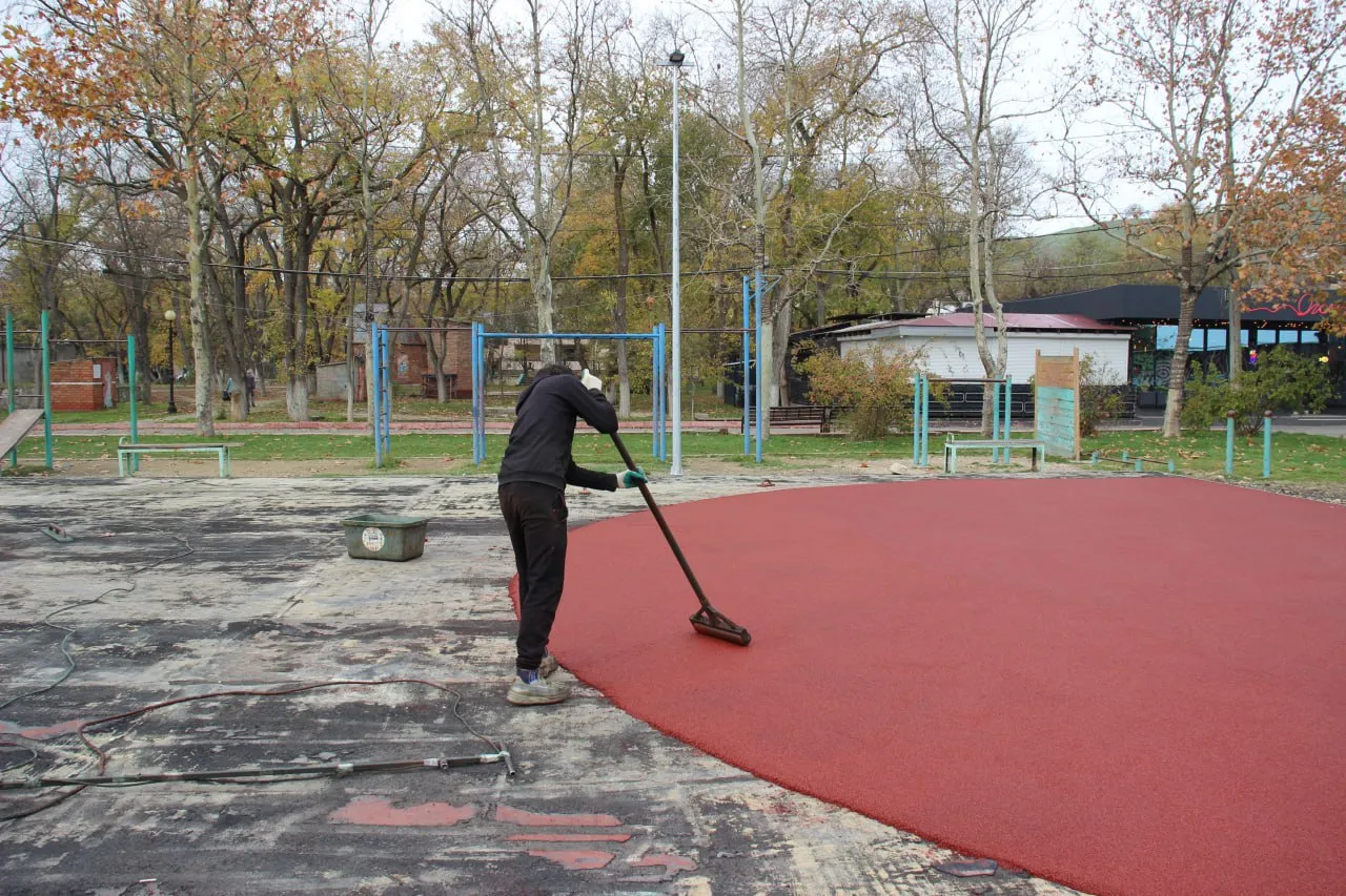 На спортивной площадке набережной Керчи укладывают резиновое покрытие